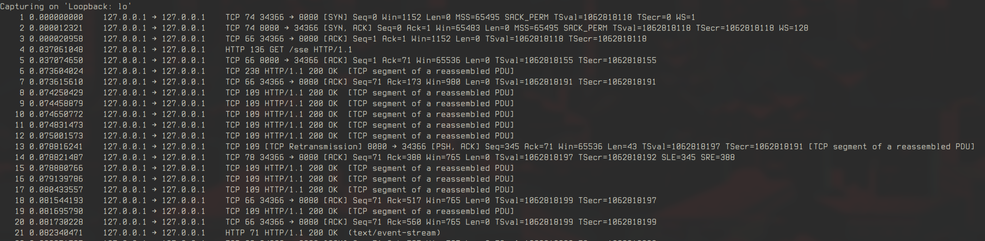 tshark captures the SSE streamand ss monitors the send and receive queues for server and client: