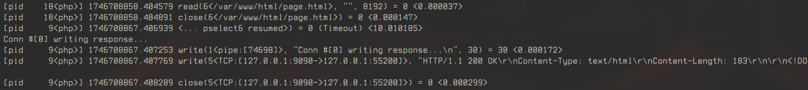 For the single-threaded server, strace shows accept calls with non-blocking flags and timings for each syscall. This helps identify slow operations. In the multi-threaded version, PHP uses pselect for polling, which slightly alters the syscall pattern but doesn’t significantly change the connection flow (open images in new tab to see the details).