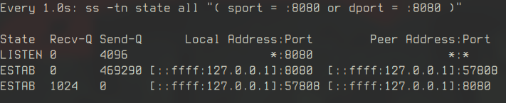 watch -n 1 'ss -tn state all "( sport = :8080 or dport = :8080 )"'