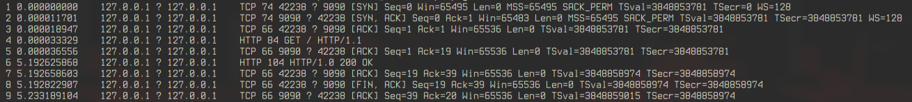 In our test, the response took 5 seconds in single-threader server and 10 seconds in multi-threaded one, since we extended the sleep for the test. Comparing single- and multi-threaded servers, tshark shows similar packet patterns.