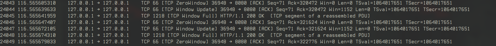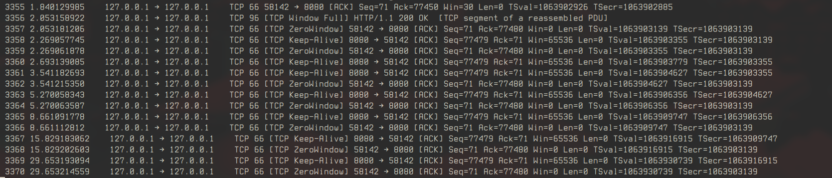 When the server’s TCP window fills, tshark shows zero-window packets, indicating flow control.